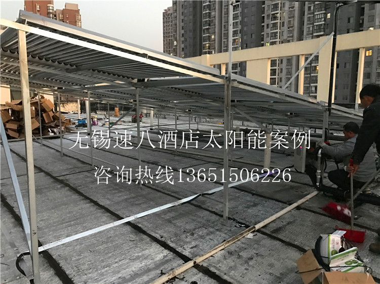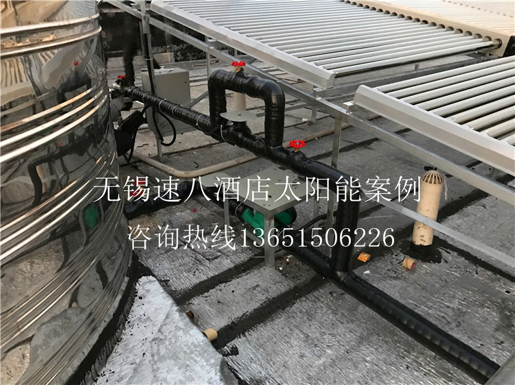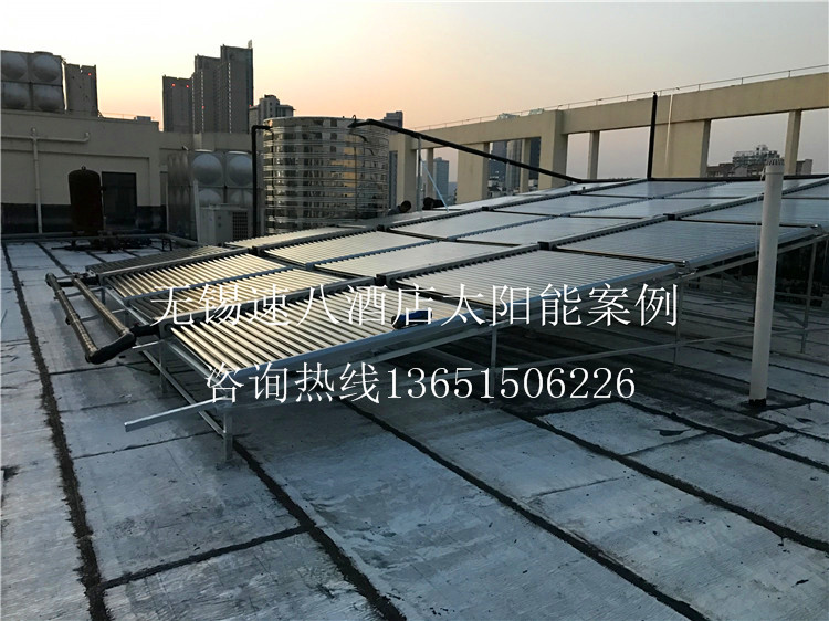 工程介绍:该工程为无锡速8酒店客房用热水,该酒店以前用的锅炉设备费用太大,这次找到我公司为其增加太阳能设备,使用下来为酒店节省了一大笔费用开支,客户非常满意,极力推荐使用。